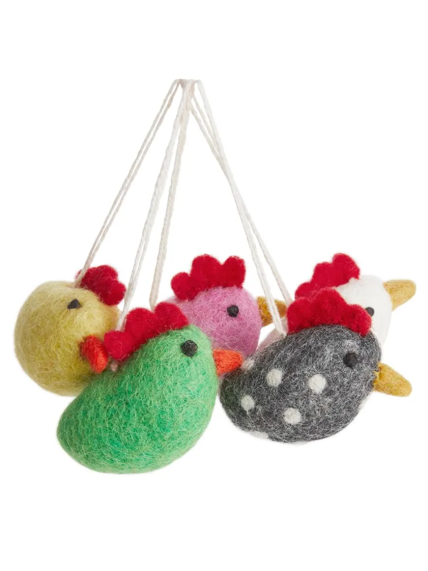 Handcrafted by small, rural businesses in Nepal, these festive decorations are made from felted wool. The set includes five small chickens with hanger loops. The decorations can be easily placed around the house and can also be used as table decor. Designed by Swedish Fairtrade brand A World of Craft. Approx 4 cm x 5 cm.