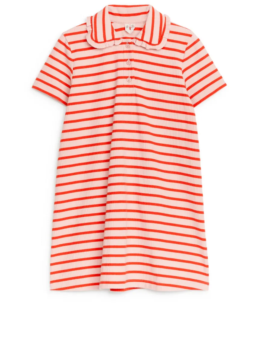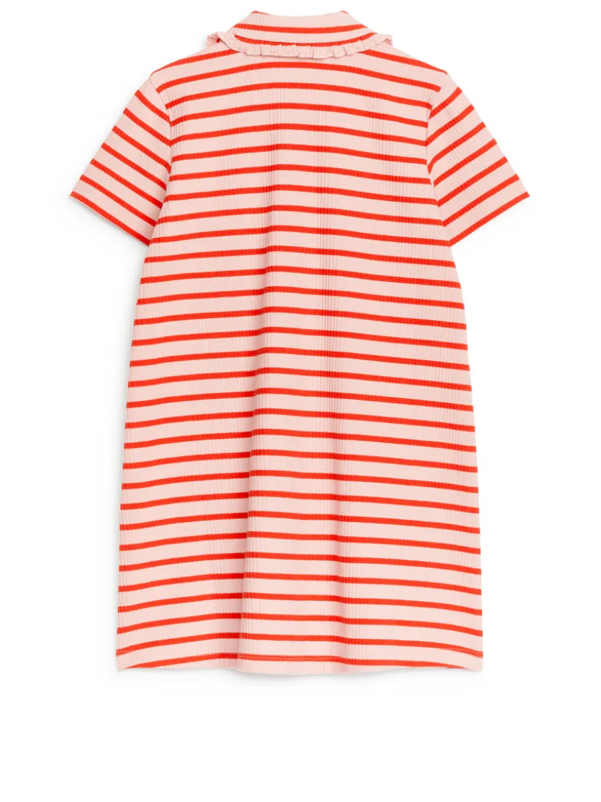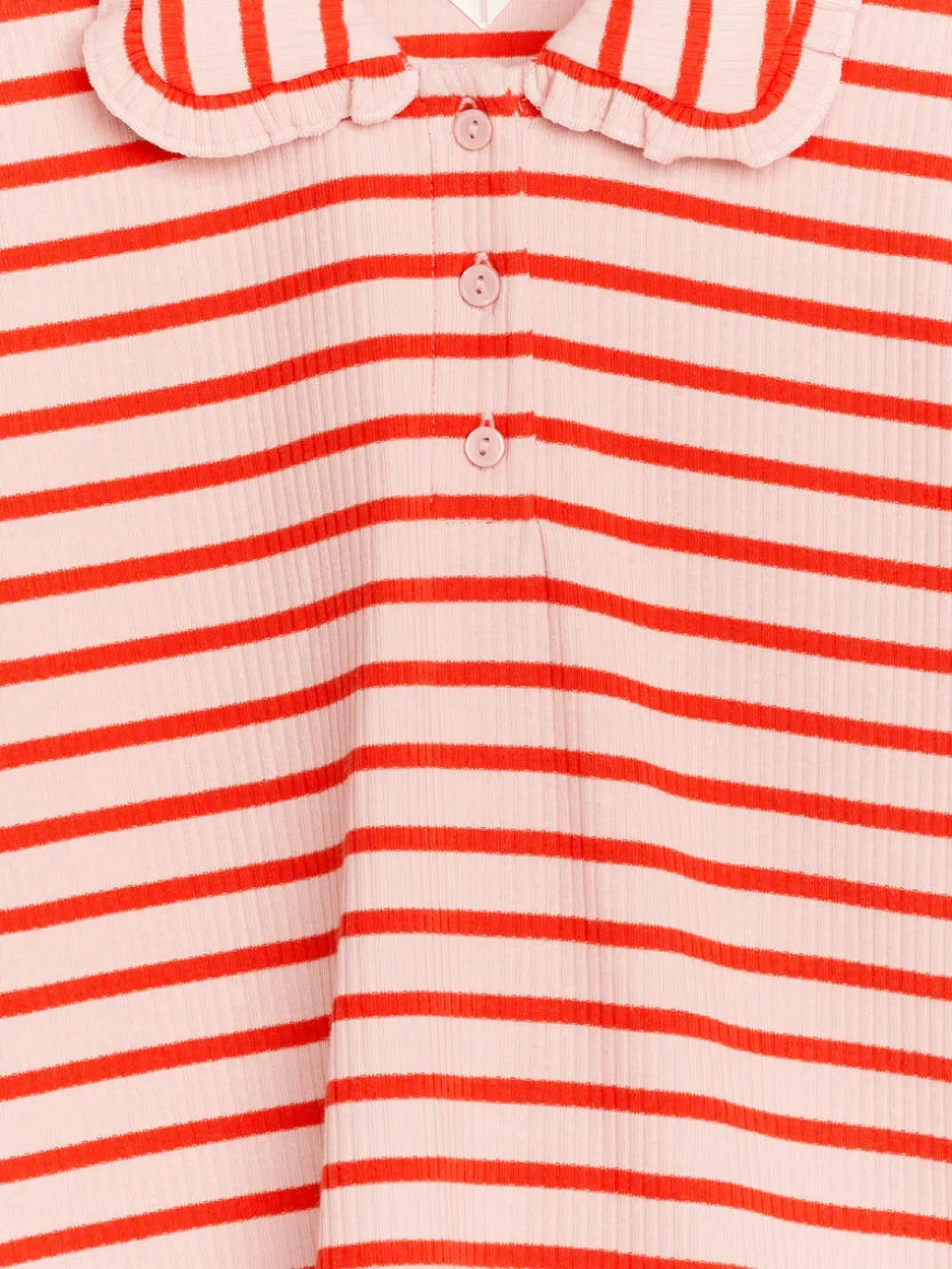 Dress with a double-layer collar with frills and a half-placket with button closure.