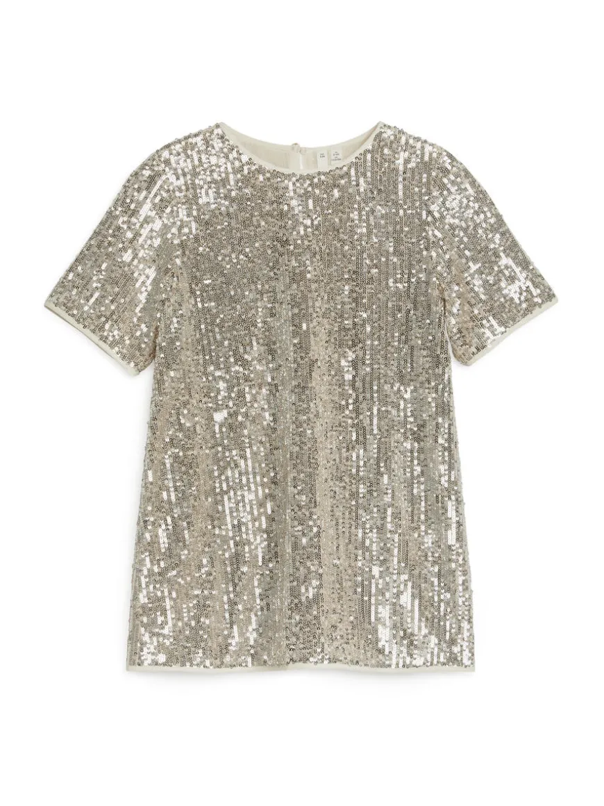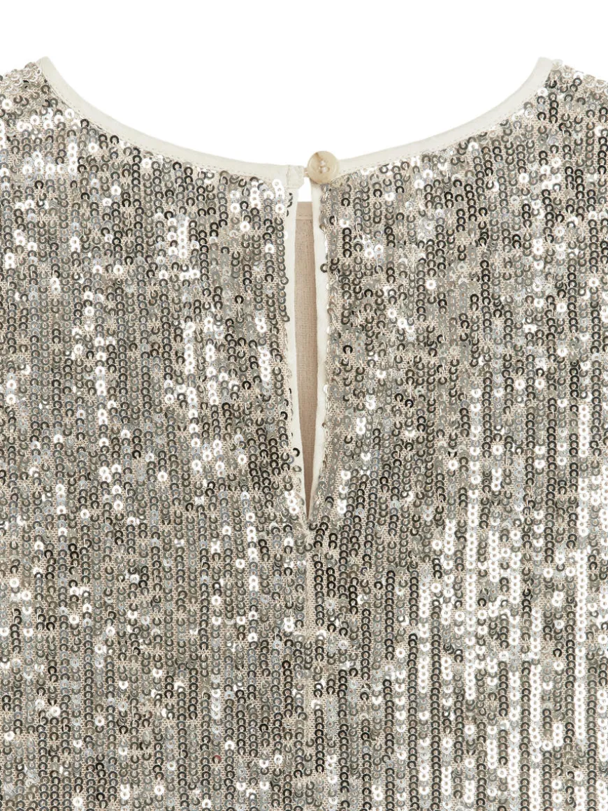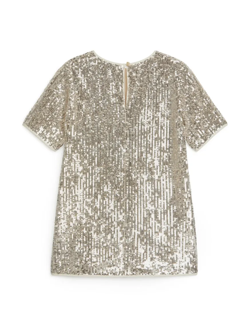 Sequin dress with short sleeves, cut to fall at knee length. This lined dress is detailed with button in back for easy dressing.