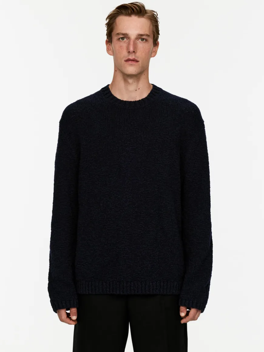 Crew-neck jumper knitted in a tape yarn made of cotton. Rib-knitted trimmings. Designed for a regular fit with slightly dropped shoulders.