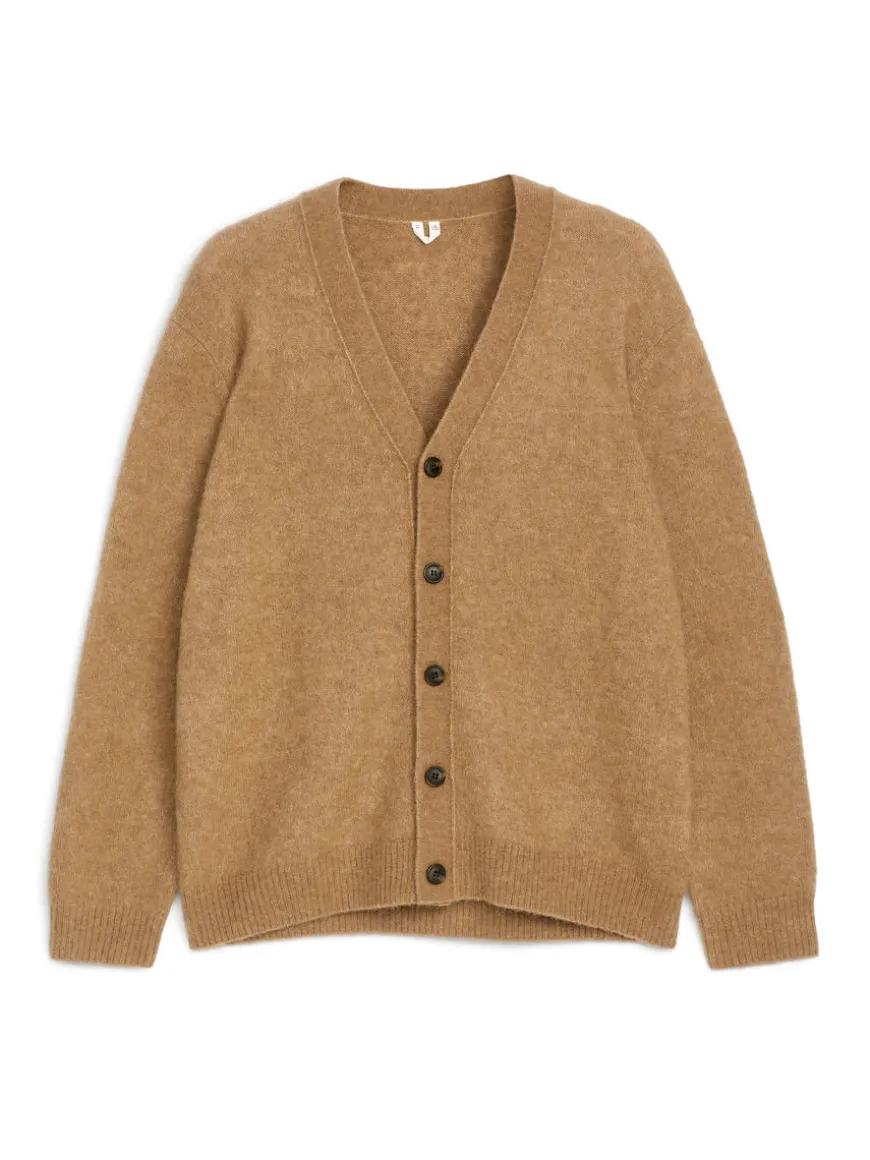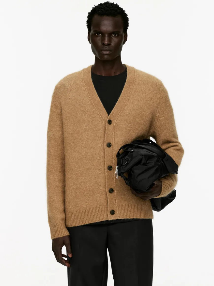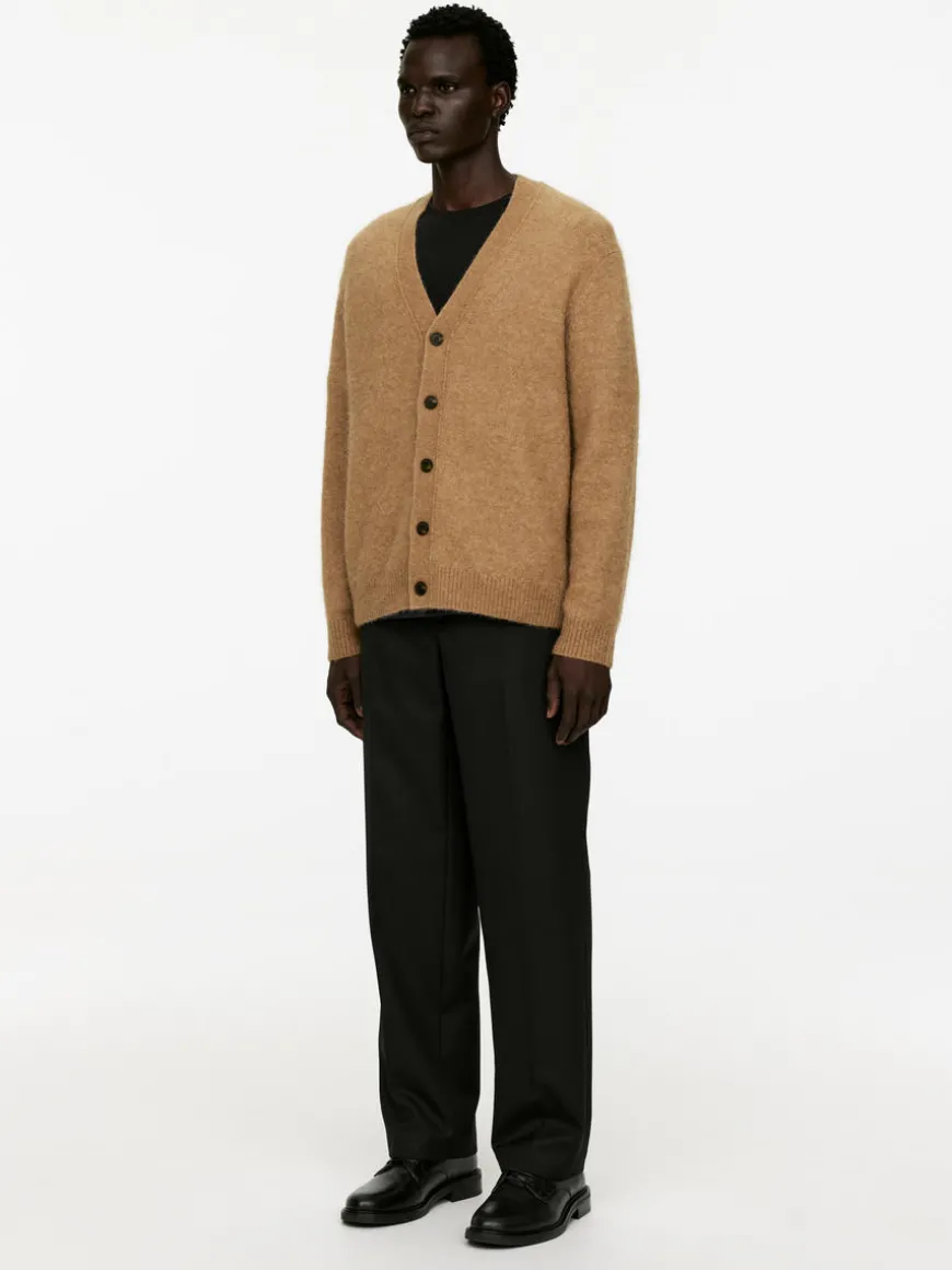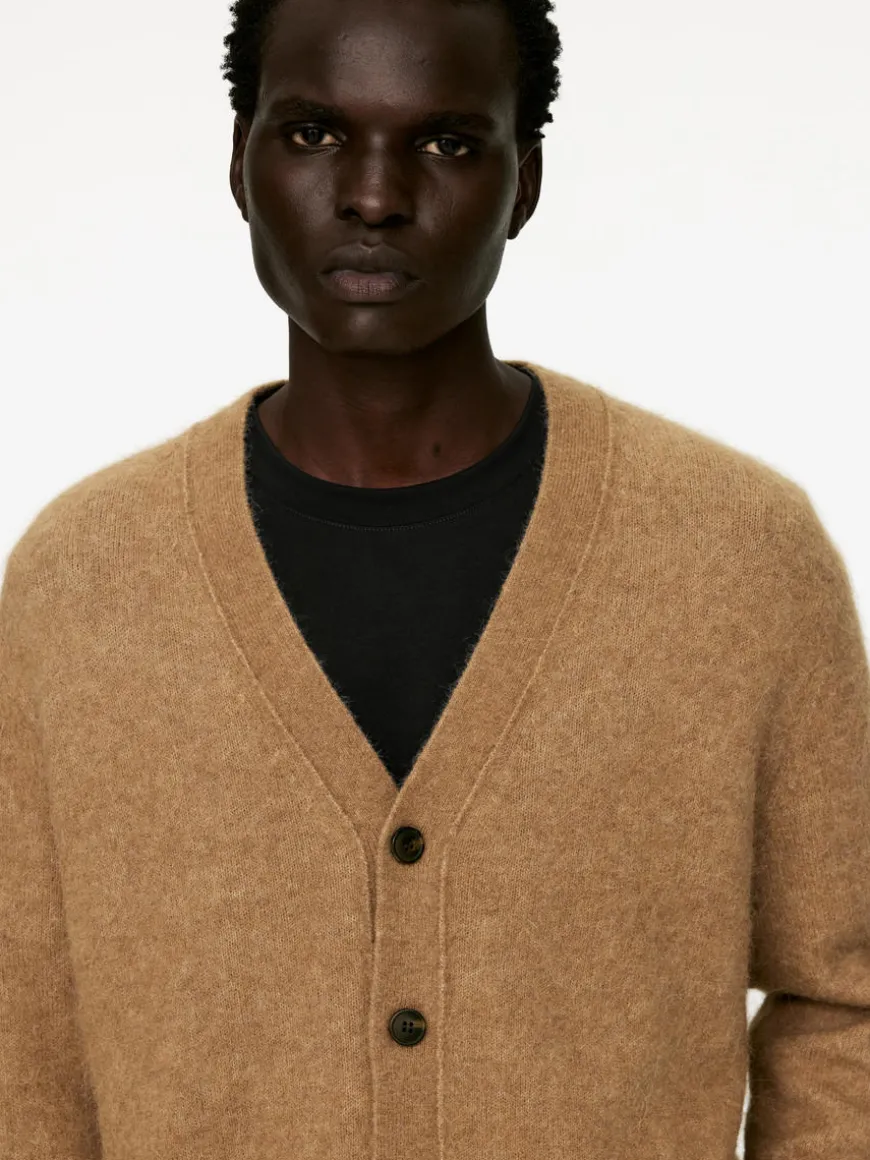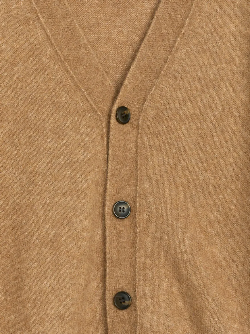 Relaxed cardigan crafted from a wool and alpaca blend with a hairy finish. A V-neck style with button clsoure and rib at cuffs and bottom hem. The jumper contains 36% RWS wool (TE-00047206). Products certified to the Responsible Wool Standard (RWS) contain wool fiber from farms independently certified to animal welfare and land management requirements.