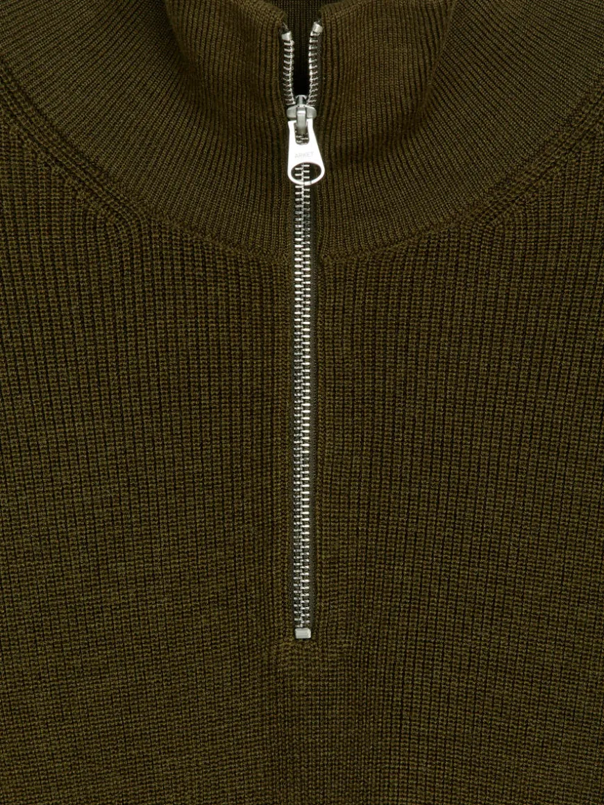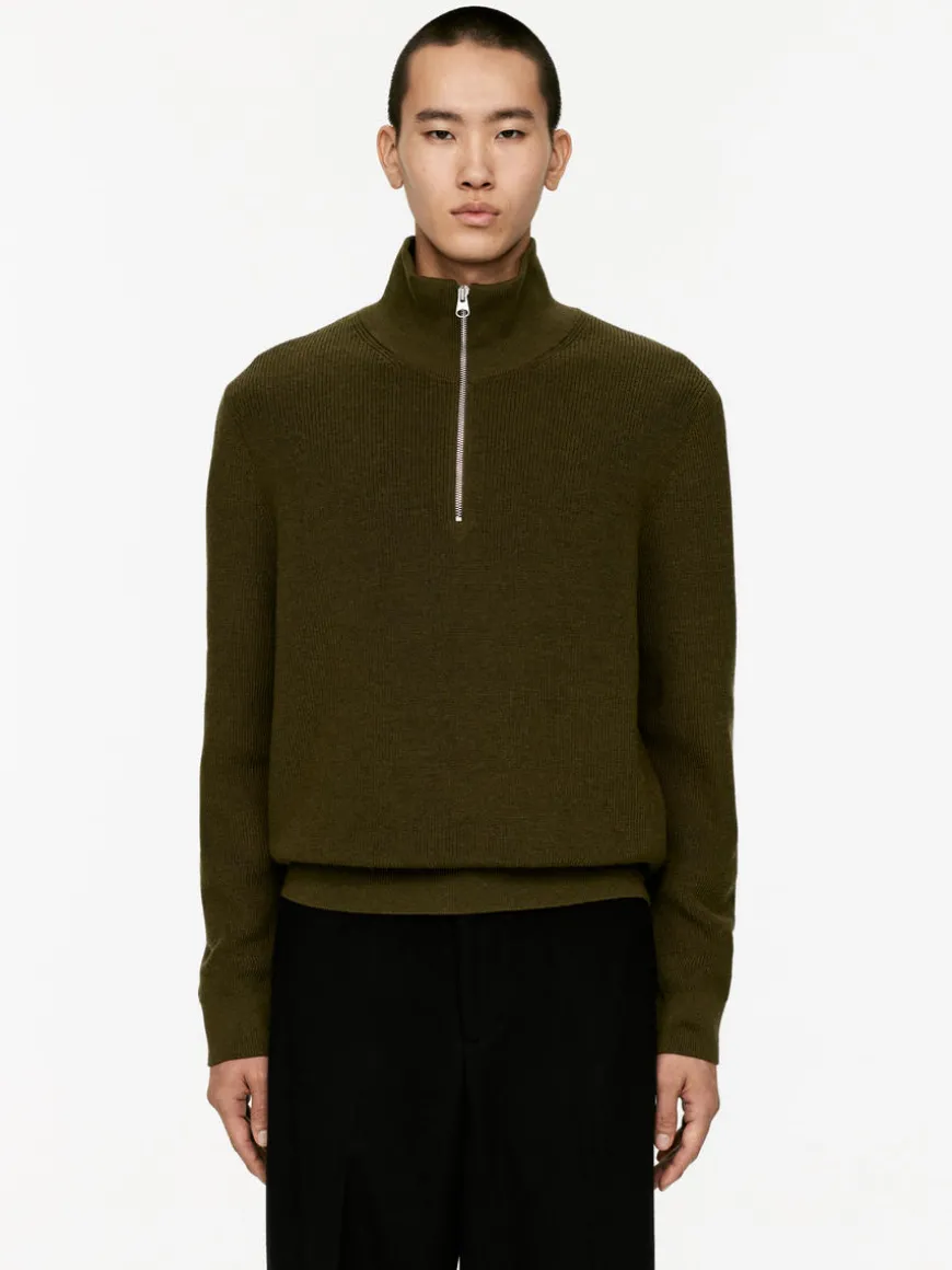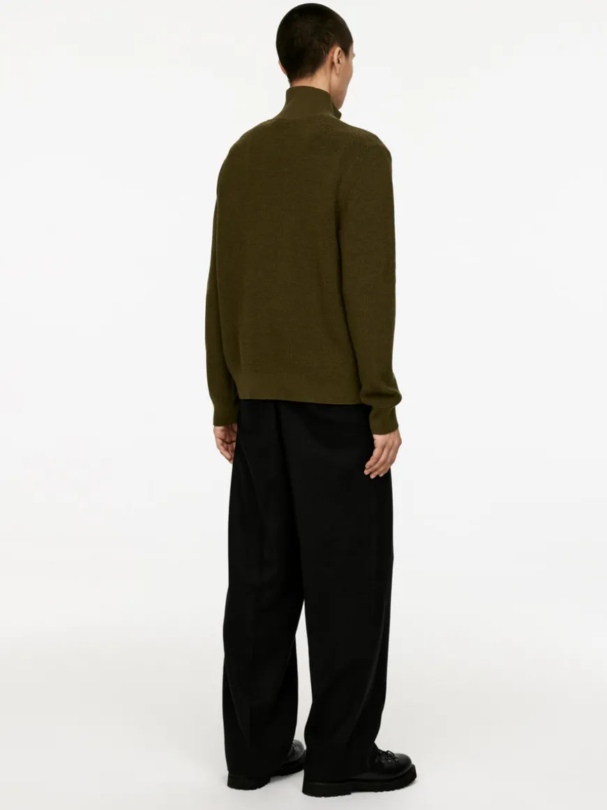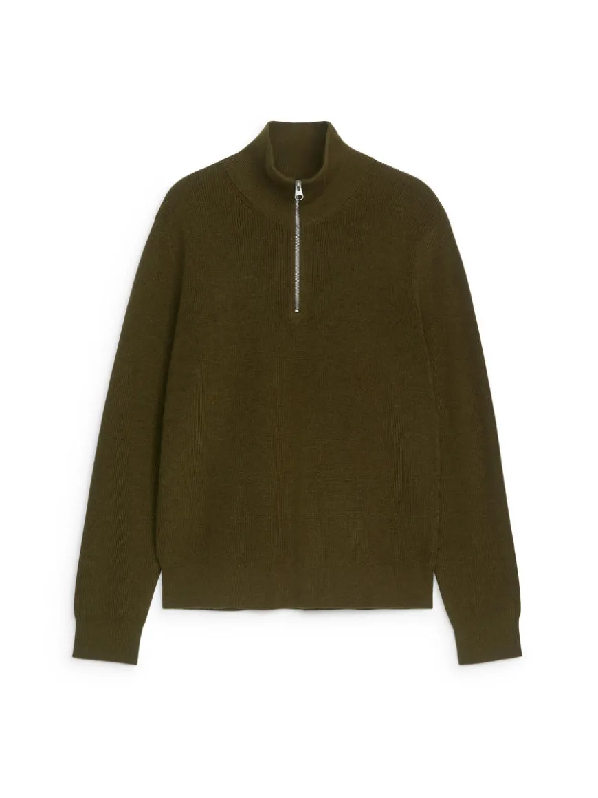 Jumper with a slightly dry feel to the touch, made in a blend of raw wool and cotton. ARKET’s Raw wool™ yarn is spun from extra-strong and slightly coarser-than-normal wool fibres. The dry feel softens with time as the fibres naturally become smoother and more pliable. The jumper is knitted in a half-cardigan stitch and features a high collar with a half zip. Ribbed trimmings. 12 gauge. The jumper contains 69% RWS wool, certified by control union 1244999. Products certified to the Responsible Wool Standard (RWS) contain wool fiber from farms independently certified to animal welfare and land management requirements.